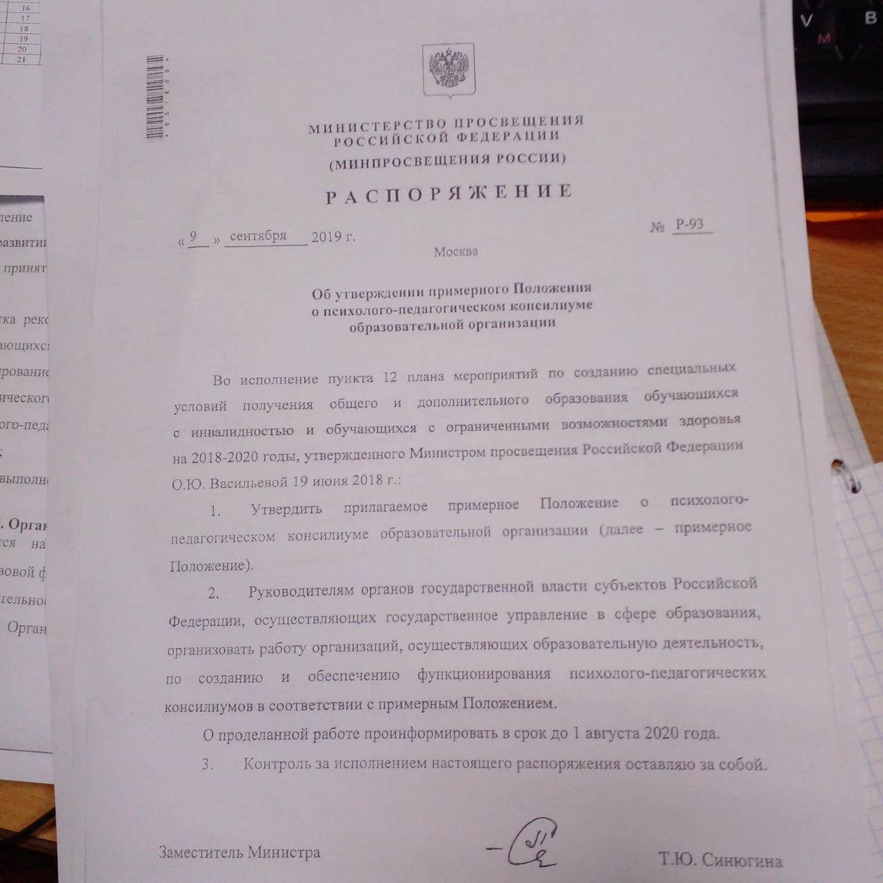 Распоряжение об утверждении примерного Положения о психолого-педагогическом консилиуме образовательной организации