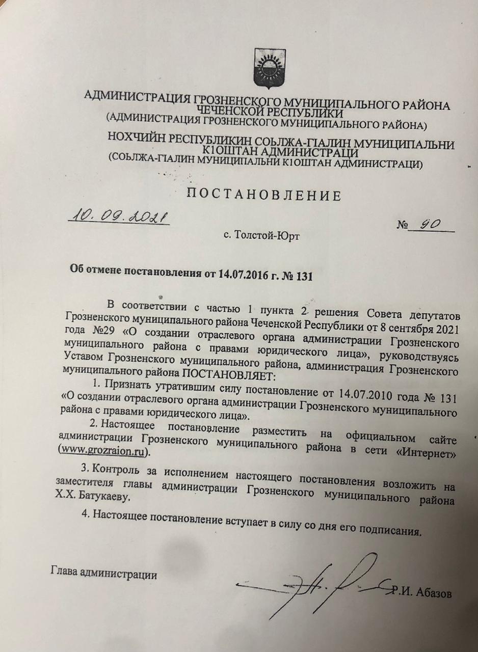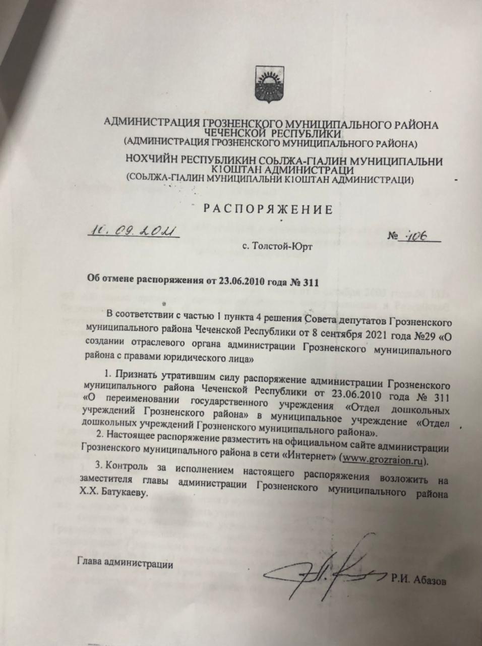 Приказ "О закреплении муниципальных бюджетных образовательных учреждений, подведомственных управлению образования Грозненского муниципального района, за территориями Грозненского района" (2021 г.)