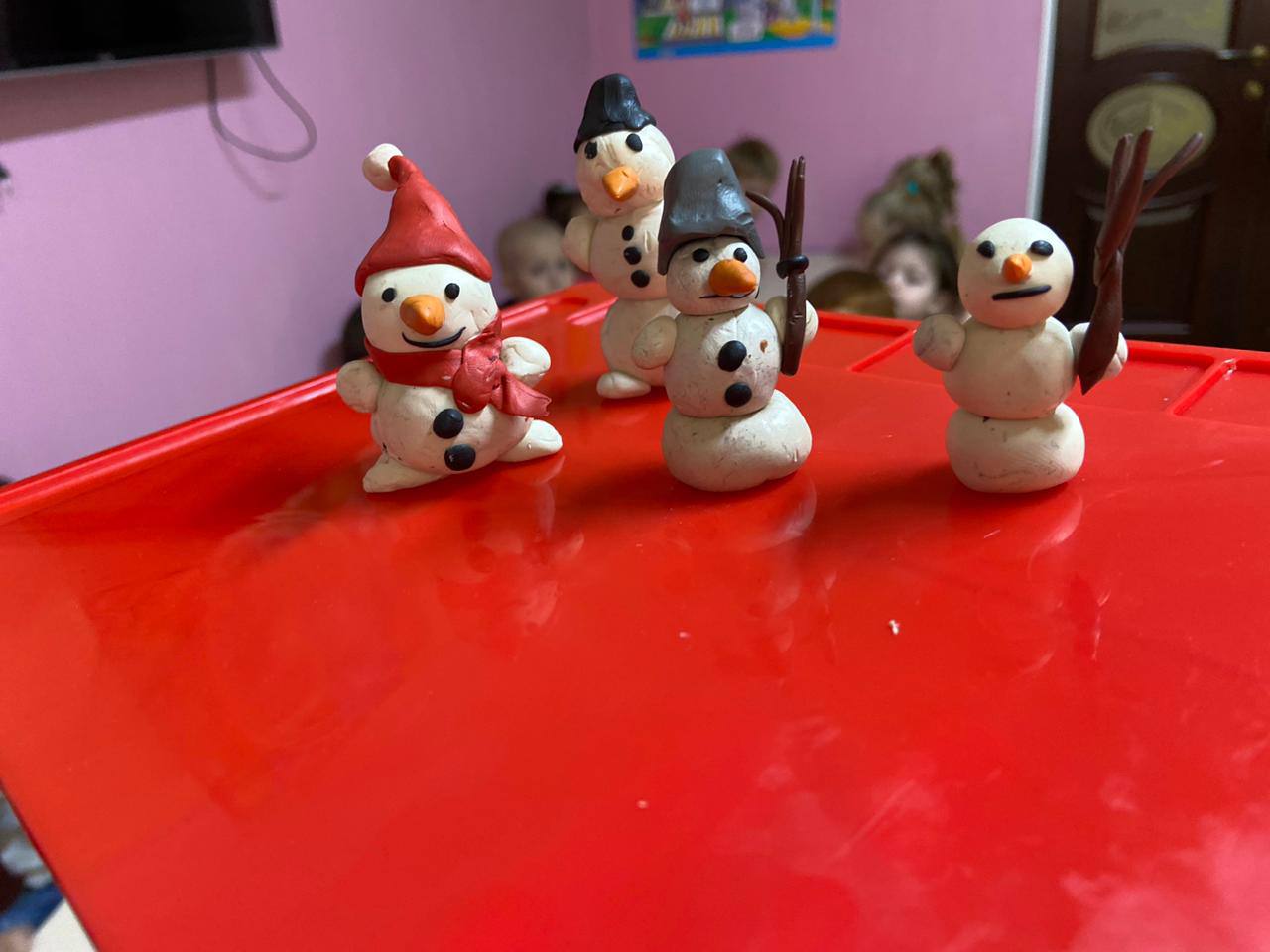 Младшая группа «Звездочки» Художественно-эстетическое развитие (лепка) .Тема: Снеговик Цели: лепить из пластилина снеговика, делить пластилин на три разные части, скатывать три шара на (большой средний, маленький)соединять части.