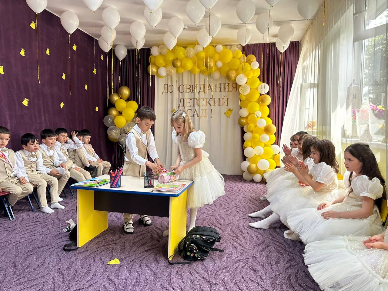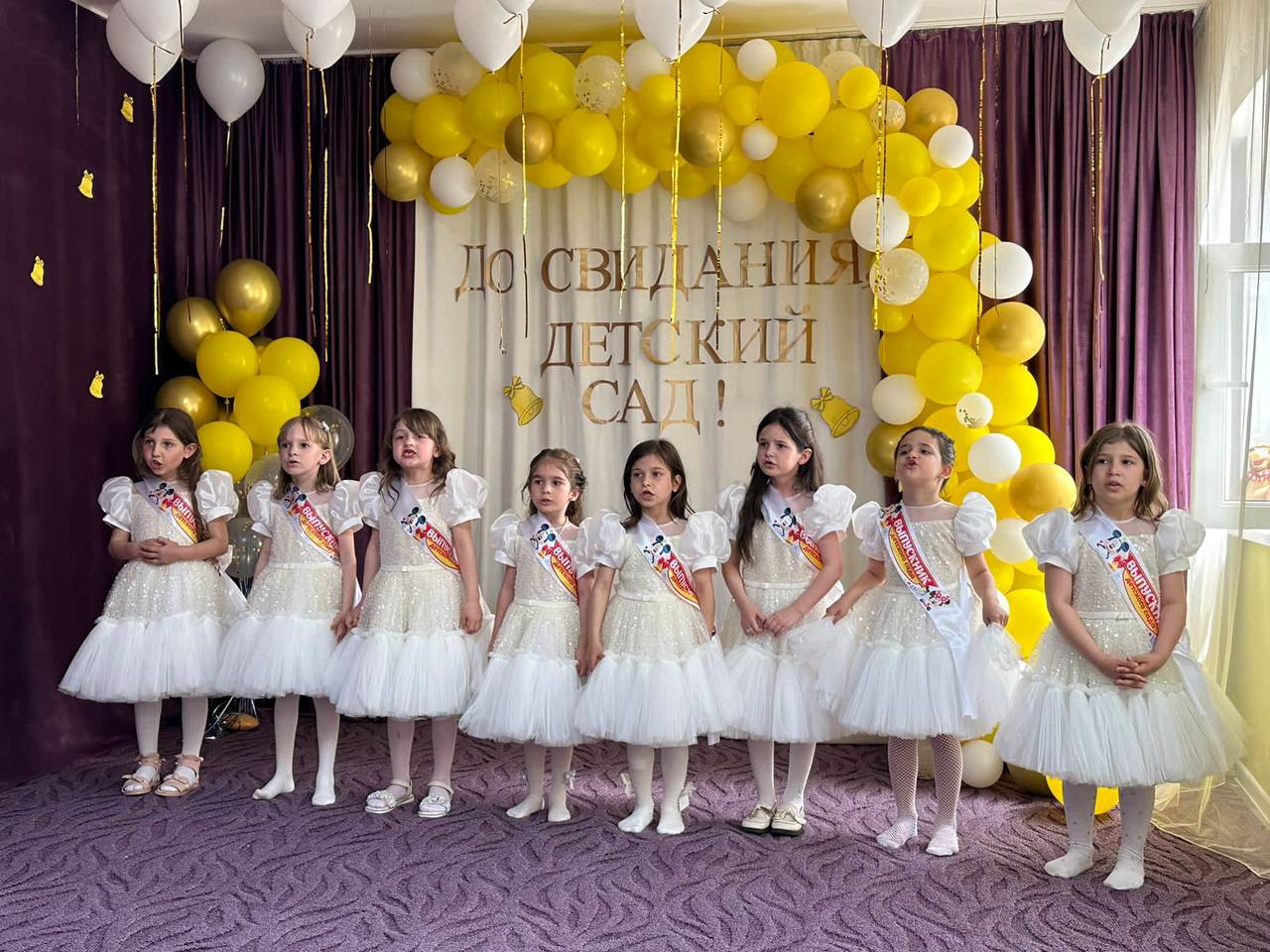 Выпускной бал в детском саду - это особое событие для каждого ребенка и его родителей, это первая ступенька во взрослую жизнь. С одной стороны это радостный, долгожданный праздник, с другой - немного грустное событие. Радостно педагогам от того, что их воспитанники переходят на новую жизненную ступеньку, а грустно - что приходиться расставаться с такими милыми, уже ставшими родными детьми. По сложившийся доброй традиции заведующая детским садом пожелала выпускникам доброго пути, успешной учебы и конечно же, вручила подарки. В конце праздника дети выпустили в небо воздушные шары. Ярким и запоминающимся стал для детей выпускной в детском саду.